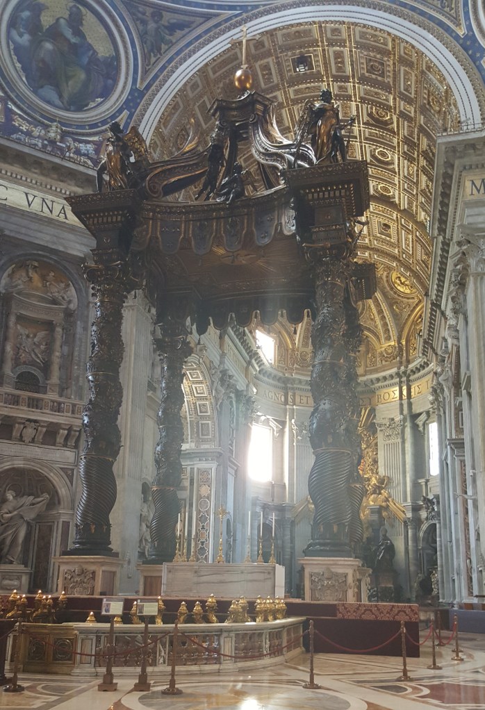 Um die Aufmerksamkeit auf das Grab Petri zu richten, wurde durch Gian Lorenzo Bernini ein Baldachin aus Bronze über dem Grab errichtet, 29m hoch. Die Bronze kam aus dem Pantheon, Papst Urban VIII ließ dort die aus Bronze bestehenden Kassetten abnehmen.
